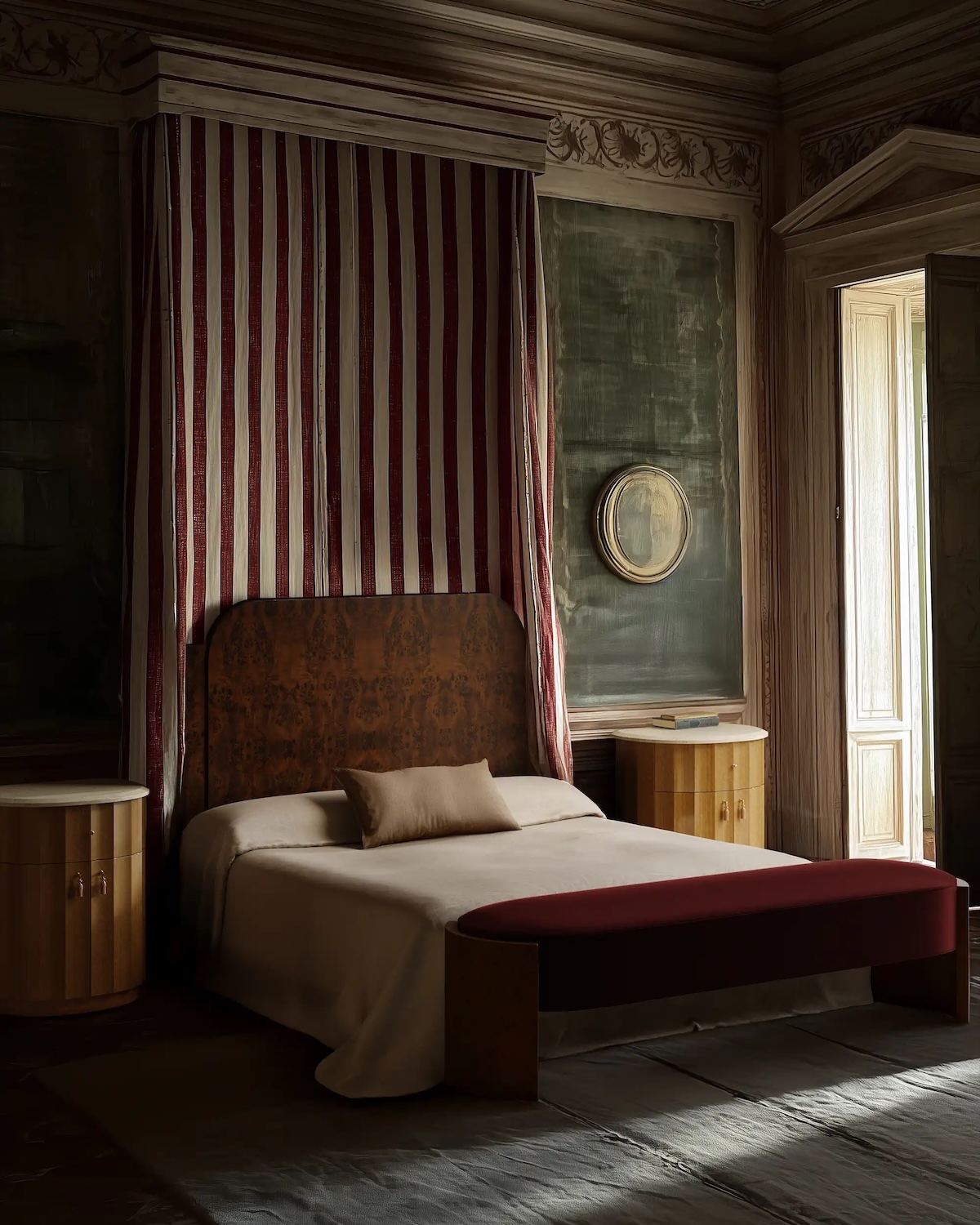 It was the green wall in the first picture that made me look twice at the image of Lemieux et Cie, which I found while looking for beds with a beadhead. Such a classic image! The bed is part of the Avenir Collection and showcases the natural beauty of mappa burl in a sculptural, architectural form. Influenced by 20th-century furniture designers Milo Baughman and T. H. Robsjohn Gibbings, it highlights organic burl patterning across a softly contoured headboard. The gentle arch introduces shape and warmth to the clean-lined frame.