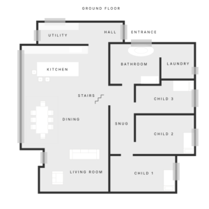 As you can see the original layout is quite structured and boxy. The kitchen is relatively small compared to the other rooms and there is only one bathroom and three bedrooms. For a family of five this is an issue!