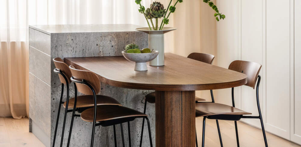 The same stone is repeated on the kitchen island, which is conceived as a separate block and almost acts as a sculptural object in the space. The dining table in walnut wood, which is complemented by the Pavilion dining chairs from &Tradition, then connects naturally from the island. Nicole brought a light playfulness to the generous space with Ferm Living pendant lights in different but coordinated shapes from the Collect collection, so as not to disturb its tranquil character.